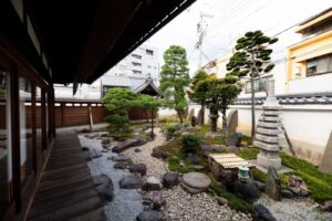 The ceremony takes place at Tea Ceremony Ju-An, Jotokuji Temple, located at 556, Gojo-sagaru, Tominokoji Dori, Shimogyo-ku, Kyoto. Once inside, face the Main Hall and look to the left for the steps leading to the tea room.